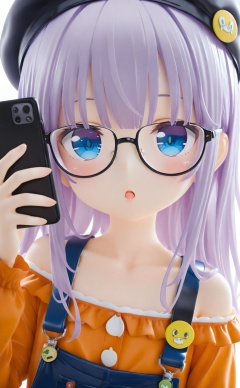 masterpiece,best quality,high quality,loli,PVC Style,1girl,solo,phone,long hair,blue eyes,glasses,cellphone,hat,off shoulder,overalls,holding,shirt,black headwear,holding phone,purple hair,under-rim eyewear,long sleeves,semi-rimless eyewear,parted lips,upper body,off-shoulder shirt,looking at viewer,collarbone,beret,white background,smartphone,black-framed eyewear,badge,bare shoulders,orange shirt,hand up,button badge,:o,simple background,<lora:pvc3——【Illustrious】hans:0.8>,