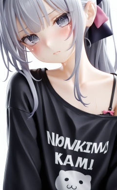 masterpiece,loli,solo,@_@,simple_background,blush,sweat,white_background,ponytail,bra_strap,off_shoulder,virtual_youtuber,grey_hair,shirt,collarbone,head_tilt,black_shirt,upper_body,single_bare_shoulder,closed_mouth,hair_bow,bow,print_shirt,long_sleeves,long_hair,1girl,hair_intakes,clothes_writing,otoko_no_ko,1boy,looking_to_the_side,male_focus,purple_eyes,pink_bow,frown,grey_eyes,<lora:pvc3——【Illustrious】hans:0.8>,