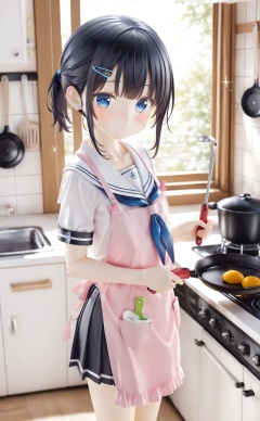 masterpiece,loli,1girl,frying pan,kitchen,stove,solo,holding frying pan,skirt,indoors,white sailor collar,school uniform,ladle,holding,pleated skirt,sailor collar,hair ornament,apron,pink apron,blue eyes,looking at viewer,black hair,holding ladle,hairclip,serafuku,sidelocks,blush,ponytail,black skirt,cooking,closed mouth,spatula,shirt,white shirt,cowboy shot,sparkle,window,short sleeves,neckerchief,blue neckerchief,standing,collarbone,short ponytail,short hair,sweat,cooking pot,<lora:pvc3——【Illustrious】hans:0.8>,