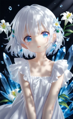 masterpiece,loli,1 girl,loli,White Dress,White short hair,braids,lily flower hair clip,upper body,cry,water,black background,Ice crystal,dappled sunlight,Suspended colorless crystal,beautiful detailed glow,(detailed ice),beautiful detailed water,<lora:pvc3——【Illustrious】hans:0.8>,