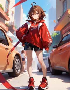 score_9,score_8_up,1girl,score_7_up,{best quality},simple plait,brown hair,red eyes,ahoge,upper body,shorts,red clothes,full body,standing,