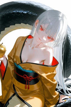 {{artist:pottsness}},[[artist:onineko]][[artist:as109]],artist:ciloranko,artist:john kafka,artist:wanke,artist:betabeet,artist:quasarcake,(artist:alphonse \(white datura\):0.3),(artist:fkey:0.1),(artist:konya karasue:0.2),(artist:dino \(dinoartforame\):0.8),(wlop:0.7),1girl,,1girl,lamia,snake tail,japanese clothes,white hair,solo,long hair,gold kimono,sash,flower,obi,holding,looking at viewer,off shoulder,makeup,red eyes,obiage,obijime,collarbone,hime cut,blunt ends,bare shoulders,holding apple,lipstick,smile,straight hair,nail polish,gold nails,red lips,eyeshadow,colored eyelashes,long sleeves,very long hair,single bare shoulder,golden apple,slit pupils,scales,gold trim,eye focus,head tilt,leaning back,downblouse,close-up,dappled light,black theme,masterpiece,best quality,very aesthetic,absurdres,