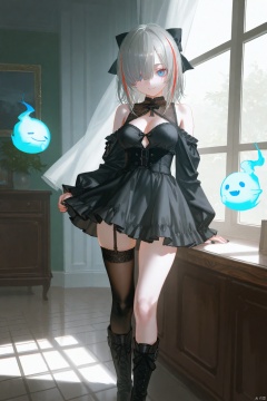 {{artist:pottsness}},[[artist:onineko]][[artist:as109]],artist:ciloranko,artist:john kafka,artist:wanke,artist:betabeet,artist:quasarcake,(artist:alphonse \(white datura\):0.3),(artist:fkey:0.1),(artist:konya karasue:0.2),(artist:dino \(dinoartforame\):0.8),(wlop:0.7),,1girl, thighhighs, breasts, solo, blue eyes, multicolored hair, ghost, cleavage, boots, black footwear, bow, black nails, smile, skirt, looking at viewer, virtual youtuber, black bow, grey hair, frills, streaked hair, hair bow, medium breasts, sleeves past wrists, asymmetrical legwear, medium hair, closed mouth, hair over one eye, black skirt, long sleeves, garter straps, black hair, knee boots, dress, bare shoulders, single thighhigh, indoors, hitodama, black thighhighs, long hair ,masterpiece,best quality,very aesthetic,absurdres