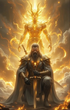 A majestic general holds a sword in one hand, kneeling on one knee as he gazes directly into the camera lens. The background is bathed in an ethereal glow as a translucent golden god appears to hover mid-air, its lower body shrouded by clouds that shimmer with a warm golden light.