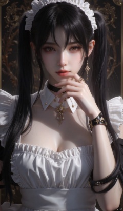 1women, long hair, breasts, looking at viewer, black hair, twintails, brown eyes, jewelry, frills, choker, necklace, apron, lips, hand on hip, wrist cuffs, maid, maid headdress, realistic, sexy apron
