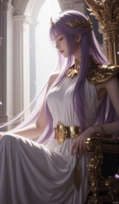 1girl, solo, long hair, breasts, bangs, hair ornament, dress, jewelry, medium breasts, sitting, very long hair, closed mouth, closed eyes, purple hair, sleeveless, indoors, white dress, armor, bracelet, from side, profile, shoulder armor, light particles, long dress, pillar, gold, laurel crown