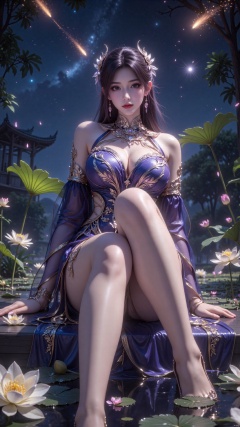 Aiming, DSLR quality, depth of field, at_viewer, dynamic poses, rich expressions, friendly smile, 1 girl, 8k resolution, masterpiece quality, high details. Shot from below, low angle shot, fantasy theme, cropped. {(1 girl: 1.5), alone, long hair, black hair, wearing hair accessories, wearing a dress, sitting, full body, her huge breasts can barely be contained by the clothes, (closer to the audience: 1.5), (see Looking at the audience: 2), beautiful face, ((worm-eye shot: 1.2)), perspective distortion}, (panoramic, fisheye lens effect: 1.1). {(Strong backlight, underexposure: 1.4), (Occlusion shadow: 0.8), Depth of field (100mm focal length: 1.2)}, (Horizontal line: 0.7), low-key earth. The feathers of the starry sky blend into the background, creating a sense of depth and gradient color. Combined with the Droste effect (endless repetition and reflection: 1.2). Show legs, long legs, beautiful legs. Pond, night, lotus leaves, lotus flowers, huge celestial bodies, deep blue atmosphere. Surrounded by fluttering petals, reflecting or casting dramatic shadows and highlights, {(Meteor Shower, Planets: 1.1), (Comet Vermilion: 1.3)}. Mesmerizing effect, dreamy atmosphere. The background is blurred, the swirl of petals, the swirl of stars.