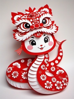 jianzhishe, paper cutting,A bright red, intricately cut paper snake flaunts a cute, human-like face with big, round eyes and a cheeky grin. Its body is decked out with floral and geometric patterns, and it's rocking a traditional Chinese dragon headpiece. The snake's scales are detailed, giving it a textured vibe. The background is a plain, light beige.,<lora:jianzhishe_v1:0.8>