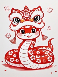 jianzhishe, paper cutting,A cute, cartoonish red snake with big, round eyes and a big, happy grin rocks a traditional Chinese dragon headpiece. Its body is decked out with red and white floral patterns. The background is plain white, making the vibrant red design pop. The snake's got a little red firework shooting out from its tail, adding a festive vibe.,<lora:jianzhishe_v1:0.8>