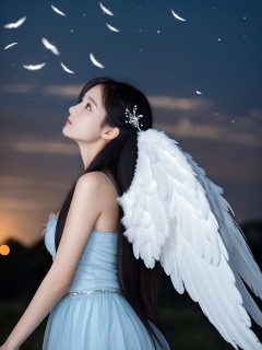 close up, shot from side, portrait of a girl wearing light blue chest length po skirt, long black hairs, she has a pair of big angel wings, her ears and cheek is covered by her wing,  she's looking up and looking afar,  on the blurry foreground are some flying white feathers, natural light at dark night. ultra high resolution