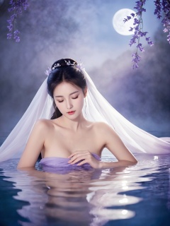 Under the caress of the moon,a woman bathes in a tranquil pool,her Hanfu of lavender a vision of tranquility. The water's gentle lapping against her skin is echoed by the soft mist that rises,creating a veil that obscures yet reveals. The scent of the night mingles with the light fragrance of the lavender,wrapping her in a cocoon of serene sensuality.,