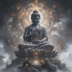 (best quality), ultra-detailed, (masterpiece), finely detail, highres, 8k wallpaper,(a 10,000-meter-high stone Buddha standing in the sky), sitting on the earth, ((head above the clouds), (lower body below the clouds), (wearing a mask :1.5), (standing in front of more than 10,000 burning incense), incense 2 meters thick, 3 kilometers to 8 height, incense, each incense written on the curve of wealth, (The incense smoke rises and gathers into the clouds to form thick black clouds), a 20-meter kite floats above the clouds, and a burning incense stick is attached to the kite, (a group of modern buildings stands at the bottom of the picture), (Wands) incense :1.5, (((close your eyes))),anhei