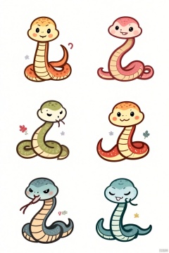A vibrant, colorful illustration featuring six unique, cute little snake designs, each with distinct role styles, expressions, and body decorations. The snakes are depicted in various poses, such as playful, curious, mischievous, and friendly, with each snake adorned in different patterns and colors like polka dots, stripes, floral motifs, and geometric shapes. The composition is dynamic, with the snakes arranged in a lively formation, their expressions and decorations clearly highlighted under soft, warm lighting. The background is minimalistic, allowing the colorful snakes to stand out, creating a cheerful and engaging visual.
