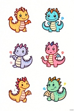 A vibrant, colorful illustration featuring six unique, cute little dragon designs, each with distinct role styles, expressions, and body decorations. The dragons are depicted in various poses, such as playful, curious, mischievous, and friendly, with each dragon adorned in different patterns and colors like polka dots, stripes, floral motifs, and geometric shapes. The composition is dynamic, with the dragons arranged in a lively formation, their expressions and decorations clearly highlighted under soft, warm lighting. The background is minimalistic, allowing the colorful dragons to stand out, creating a cheerful and engaging visual.