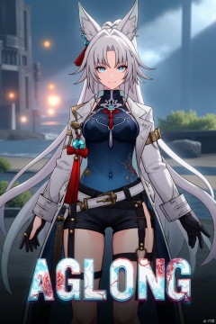 A movie poster featuring a solo 1girl with long white hair tied in a ponytail, bangs, and animal ears. She has blue eyes, a smile looking at the viewer, wearing black gloves, shorts, a belt with a thigh strap and tassel, a jacket and coat draped over her shoulders. She is holding something, with a dynamic pose in a stylized setting. The background is cinematic with dramatic lighting. Below her, centered, is three-dimensional text reading AGlong in bold, matching the poster's theme.