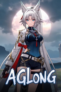 A cinematic movie poster featuring a solo 1girl with long white hair in a ponytail, bangs, and animal ears. She has blue eyes, a smile looking at the viewer, wearing black gloves, shorts, a belt with a thigh strap and tassel, a jacket and coat draped over her shoulders. She is holding something, posed dynamically against a dramatic, stylized background with cinematic lighting. Below her, centered, is bold three-dimensional text reading AGlong, matching the poster's theme.