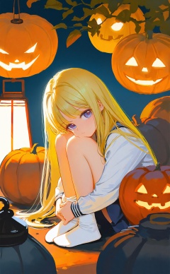 masterpiece,best quality,high quality,loli,(artist:ningen_mame:0.9),(artist:sho_(sho_lwlw):0.9),(artist:rhasta:0.9),(artist:wlop:0.7),(artist:ke-ta:0.6),(fkey:0.5),(tianliang duohe fangdongye:0.5),(hiten \(hitenkei\):0.6),loli,artist:ciloranko,artist:chenbin,artist:tianliang duohe fangdongye,bright outline,1girl,solo,long_hair,blonde_hair,sitting,socks,pumpkin,lantern,