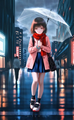 masterpiece,best quality,high quality,loli,[Artist:wlop],Artist:hiten_(hitenkei),[[Artist:sheya]],umbrella,scarf,holding umbrella,rain,skirt,outdoors,holding,1girl,red scarf,brown hair,bag,sky,blue skirt,night,pleated skirt,shoes,socks,coat,sneakers,looking at viewer,short hair,shirt,brown eyes,1boy,transparent,transparent umbrella,city,building,open clothes,standing,cloud,walking,long sleeves,white shirt,cloudy sky,jacket,parted lips,sign,miniskirt,shoulder bag,lamppost,open coat,solo focus,full body,road sign,