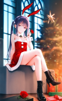 masterpiece,blurry background,loli,light leaks,fair_skin,blurry,depth_of_field,Cinematic Lighting,background light,loli,Artist:hiten_(hitenkei),artist chen_bin,artist:wanke,(artist:ke-ta:0.6),[Artist:wlop],[[Artist:sheya:0.9]],loli, 1girl, animal ears, solo, gift, flower, red dress, dress, holding, sitting, rabbit ears, red flower, christmas, long hair, rose, crossed legs, christmas tree, twintails, looking at viewer, red rose, box, holding flower, gift box, purple hair, boots, fur trim, christmas present, fur-trimmed dress, full body, santa dress, high heels, very long hair, breasts, red eyes, pink eyes, black footwear, bare shoulders, bow, santa costume, fake animal ears, smile, bare legs, window, indoors, ribbon, white wrist cuffs, purple eyes
