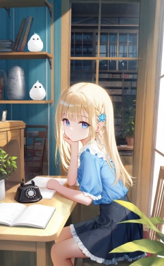masterpiece,best quality,high quality(,loli:2),jima,torino_aqua,miwabe_sakura,(wlop:0.8),ciloranko,iumu,ask_\(askzy\),bison_cangshu,yunsang,ningen_mame,sho_\(sho_lwlw\),rhasta,(deyui:0.4),chen_bin,gujianshaonu,turisasu,nekojira,omone_hokoma_agm,loli, 1girl, sitting, window, skirt, indoors, mouse, book, long hair, bird, shirt, blue eyes, solo, black skirt, blue shirt, short sleeves, bookshelf, blonde hair, braid, flower, frills, hair ornament, book stack, animal, table, puffy sleeves, puffy short sleeves, desk, looking at viewer, chair, closed mouth, from side, ribbon, english text, frilled skirt, rotary phone, frilled shirt, potted plant