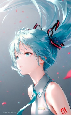 masterpiece,best quality,high quality,loli,Artist:hiten_(hitenkei),artist chen_bin,artist:wanke,(artist:ke-ta:0.6),[Artist:wlop],[[Artist:sheya:0.9]],loli, 1girl, hatsune miku, solo, petals, long hair, twintails, tears, eyelashes, looking up, blurry, shirt, ribbon, aqua hair, depth of field, nail polish, sleeveless shirt, crying, sleeveless, collared shirt, crying with eyes open, aqua nails, closed mouth, bare shoulders, upper body, character name, floating hair, aqua eyes, hair ribbon, close-up, lips, fingernails, light smile, falling petals, black ribbon, blurry background, necktie, looking afar, blue nails, grey shirt, artist name, blurry foreground, white shirt, english text