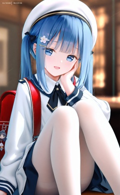 masterpiece,blurry background,loli,light leaks,fair_skin,blurry,depth_of_field,Cinematic Lighting,background light,loli,himitsu_(hi_mi_tsu_2),Artist haneru,Artist:hiten_(hitenkei),artist chen_bin,artist:wanke,(artist:ke-ta:0.6),[Artist:wlop],(Artist agwing86:1.3),(Artist aki99:0.5),(Artist z282g:0.66),loli, 1girl, hat, solo, bag, blue hair, blue eyes, white headwear, backpack, white pantyhose, pantyhose, randoseru, hair ornament, blush, shirt, long hair, white shirt, charm \(object\), beret, hairclip, long sleeves, looking at viewer, twintails, open mouth, indoors, knees up, bag charm, black bow, white jacket, smile, bow, \:d, hand up, sitting