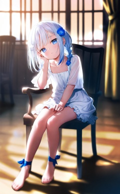 masterpiece,blurry background,loli,light leaks,fair_skin,blurry,depth_of_field,Cinematic Lighting,background light,1girl, flower, dress, solo, toes, hair ornament, white dress, blue eyes, sitting, hair flower, blue flower, looking at viewer, feet, braid, blurry, frills, see-through, indoors, frilled dress, blurry background, full body, on chair, twin braids, chair, short sleeves, toenails, white hair, collarbone, window, hair over shoulder, blue hair, parted lips, legs, blush, shadow, head tilt, medium hair, hand on own face, depth of field, barefoot, low twin braids, multicolored hair, sidelocks, wooden floor, hand up, leg ribbon, long hair, curtains, hand on own cheek, ankle ribbon, cross-laced clothes, see-through sleeves, virtual youtuber, frilled sleeves, no shoes