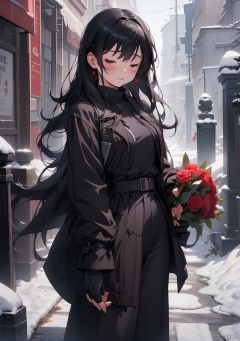 tuiwen,1girl,1boy,black hair,gloves,flower,long hair,red flower,coat,holding flower,closed eyes,white gloves,rose,fur trim,snow,holding,snowing,outdoors,graveyard,tombstone,bare tree,short hair,jewelry,black coat,earrings,bouquet,red rose,winter,tree,jacket,black jacket,long sleeves,grey gloves,
