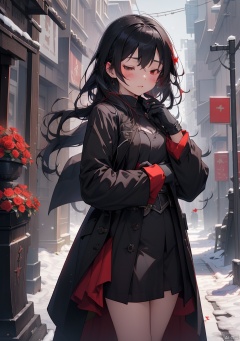 tuiwen,1girl,1boy,black hair,gloves,flower,long hair,red flower,coat,holding flower,closed eyes,white gloves,rose,fur trim,snow,holding,snowing,outdoors,graveyard,tombstone,bare tree,short hair,jewelry,black coat,earrings,bouquet,red rose,winter,tree,jacket,black jacket,long sleeves,grey gloves,