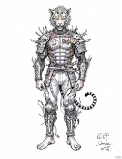 ink-painting,grayscale, monchrome,solo,1boy,male focus,armor,shoulder armor,tail,furry,white background,full body,animal ears,signature,looking at viewer,furry male,pauldrons,japanese armor,simple background,barefoot,pants,facial hair,fangs,tiger,tiger tail,tiger ears,open mouth,teeth,year of the tiger,muscular,