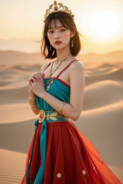 a beautiful Asian woman stands in a stunning pose, adorned with a crown on her head. She is dressed in a turquoise and red gown, adorned by a gold belt adorned with intricate embroidery. Her hair is styled in a sleek bob, and her bangs are adorned with gold bracelets. The backdrop is a sandy beach, with the sun setting in the distance, adding a touch of warmth to the scene.