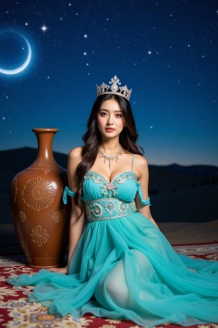 a beautiful woman, dressed in a turquoise dress, adorned with a crown, is seated on a carpeted floor. The woman's hair is long, cascading down her shoulders, adding a touch of beauty to the scene. The backdrop, a vibrant blue sky, is adorned with white stars, creating a stark contrast to the woman's dress. To the left of the woman, a brown vase with intricate carvings is positioned on the floor, adding depth to the composition.