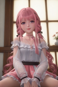 masterpiece, best quality, masterpiece,best quality,official art,extremely detailed CG unity 8k wallpaper,1girl,solo,long hair,looking at viewer,smile,bangs,skirt,shirt,long sleeves,twintails,jewelry,very long hair,collarbone,white shirt,pink hair,braid,frills,choker,virtual youtuber,pink eyes,necklace,pink skirt,off-shoulder shirt,frilled shirt,see-through sleeves,pink bow,white socks,floral print,socks,(fetal position:1.3),sitting,from below,Bow Socks,See-through Floral Socks,(fetal_position),(fetal_position:1.3),pov