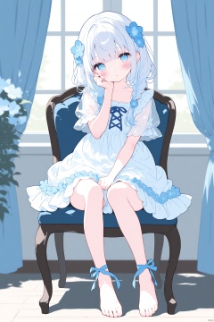 masterpiece,best quality,high quality,loli,1girl, flower, dress, solo, toes, hair ornament, white dress, blue eyes, sitting, hair flower, blue flower, looking at viewer, feet, braid, blurry, frills, see-through, indoors, frilled dress, blurry background, full body, on chair, twin braids, chair, short sleeves, toenails, white hair, collarbone, window, hair over shoulder, blue hair, parted lips, legs, blush, shadow, head tilt, medium hair, hand on own face, depth of field, barefoot, low twin braids, multicolored hair, sidelocks, wooden floor, hand up, leg ribbon, long hair, curtains, hand on own cheek, ankle ribbon, cross-laced clothes, see-through sleeves, virtual youtuber, frilled sleeves, no shoes