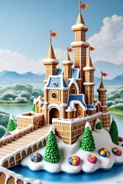 handmade colored knitted wool,handmade white knitted wool,no humans,sky,scenery,blue sky,building,flower,day,cloud,outdoors,river,knitted wool,riverside scenery,green mountains and sky in the distance,gingerbread,Ultra HD quality,The elaborate gingerbread great wall,adorned with snow and Christmas decorations,gingerbread disneyland castle,swirly mints,lollipops,gumdrops,decorative frosting,,(,c4d,OC rendering,,,瓷器,porcelain