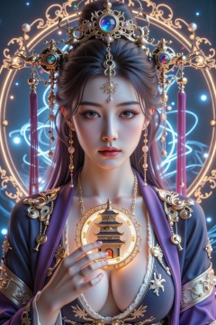 PLAY BOY cover of a beautiful Chinese woman with long purple,straight hair,The girl held the seven-treasure Linglong Tower, which was golden in color and emitted seven-color divine lightneck and shoulders encased in golden and silver mechanical components, art deco and steampunk fusion, elegant filigree details, holding the pagoda in both hands close to her face,(White and plump super breasts leaked from the chest of clothes),(huge breasts:2.79),(full breasts:1.99), posing for the magazine cover, professional photography with studio lighting, blue background, text at the top says "RAP", photo taken with a Canon EOS R6 Mark II Mirrorless camera in the style of 35mm f/8 aperture, intricate details.dlrb,zly,large natural breast,soft breasts,ddw