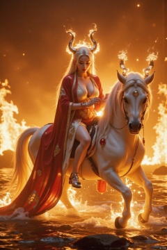 Chinese aesthetics, beautiful lighting, white skin,A mystical creature emerges from the flames: a lone maiden with waist-length white locks and gleaming horns, her breasts barely contained beneath a flowing cloak. She sits astride a fiery steed, mane ablaze as she rides forth against a backdrop of roaring inferno, her long hair streaming behind like a river of fire. 8K, HD,High quality, 8K.intricate details.dlrb,hsw,wet,water,beauty,anhei,large natural breast, taken by Sony Alpha 7R IV, Zeiss Otus 85mm F1.4, ISO 100 Shutter Speed 1/400, Vivid picture, intricate background,xuanhuanfapao,qihuanmopan,hkgod,mohuan,ddw