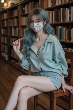 In a quiet corner of a library, a girl with long, curly light blue hair sits on a wooden stool, her hair cascading down her back. She's wearing a loose, high-collared shirt that's partially unbuttoned, showing off her collarbone. A patterned mask covers her mouth, and she wears round, silver-rimmed glasses that reflect the soft library lights. Her makeup is subtle, with a touch of shimmer on her lids. She leans forward, one leg crossed over the other, her thighs visible in a relaxed, scholarly pose. The camera captures her from a three-quarter angle, highlighting the curve of her body and the softness of her pose against the backdrop of bookshelves filled with old tomes. The scene captures the essence of youthful intellect and a laid-back, studious mood.