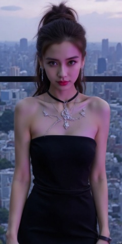 ,,meinvzi,best quality, masterpiece, realistic,(Good structure), DSLR Quality,Depth of field,,looking_at_viewer,Dynamic pose, neonpunk style Neon noir leogirl,hANMEIMEI,realistic photography,,On the rooftop of a towering skyscraper,a girl stands,facing the camera directly. Behind her,a multitude of skyscrapers stretches into the distance,creating a breathtaking urban panorama. It's the perfect dusk moment,with the evening sun casting a warm glow on the girl's face,intensifying the scene's impact. The photo captures a sense of awe,with the sharpness and realism making every detail vivid and clear,Hair fluttered in the wind,long hair,halterneck, . cyberpunk, vaporwave, neon, vibes, vibrant, stunningly beautiful, crisp, detailed, sleek, ultramodern, magenta highlights, dark purple shadows, high contrast, cinematic, ultra detailed, intricate, professional,,
