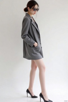 A 14-year-old woman,full body photo,bright light,coat,ponytail,short hair,white skin,cxy,sideways,wearing sunglasses,encil skirt,long and slim and thin legs,high heels,nipples can be seen under clothes,cxy,medium breast