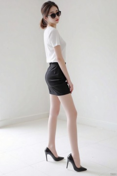 A 14-year-old woman,full body photo,bright light,ponytail,short hair,white skin,cxy,sideways,wearing sunglasses,encil skirt,long and slim and thin legs,high heels,nipples can be seen under clothes,cxy,medium breast