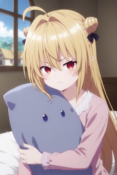 1girl,solo,long hair,looking at viewer,bangs,blonde hair,red eyes,hair between eyes,closed mouth,collarbone,、、,pointy ears,gradient,:t,object hug,pout,,Indoor,Window,Village,Sunshine,hair bun ahoge hair bow,sit on the bed,Pink pajamas