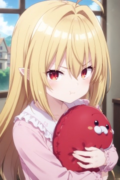1girl,solo,long hair,looking at viewer,bangs,blonde hair,red eyes,hair between eyes,closed mouth,collarbone,upper body,pointy ears,gradient,:t,object hug,pout,,Indoor,Window,Village,Sunshine,ahoge,Pink frills pajamas,angry,Referring to others