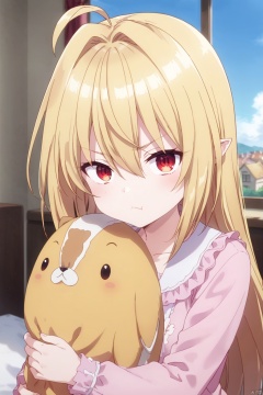 1girl,solo,long hair,looking at viewer,bangs,blonde hair,red eyes,hair between eyes,closed mouth,collarbone,upper body,pointy ears,gradient,:t,object hug,pout,,Indoor,Window,Village,Sunshine,ahoge,Pink frills pajamas,angry,Referring to others,(profile:0.6)