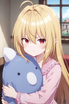 1girl,solo,long hair,looking at viewer,bangs,blonde hair,red eyes,hair between eyes,closed mouth,collarbone,upper body,pointy ears,gradient,:t,object hug,pout,,Indoor,Window,Village,Sunshine,ahoge,Pink frills pajamas,angry,Referring to others,(profile:0.6)