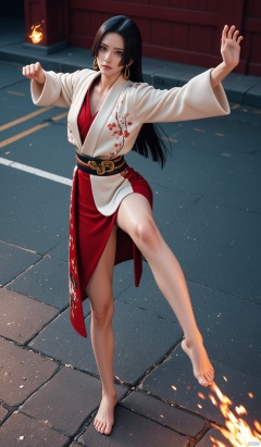 (masterpiece, best quality, ), slum background, Boa Hancock. from above, barefoot, foot focus, high kick with a trail of red fire,long black hair, standing on one leg, red lighting, (anime coloring:0.3),score_9_up score_8_up score_7_up score_6_up,BLENDER STYLE