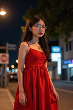 A 14-year-old woman,at night,bright ,red dress ,(white skin:1.2),wavy hair,cxy,sideways,wearing glasses,Thin face, melon face, pointy face,smooth skin,full_body,bare long legs,nine-headed body,wearing broad shoes,smile