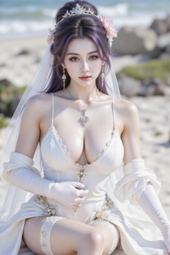 masterpiece,best quality,high quality,solo, 1girl,dress, breasts, looking at viewer, long hair, gloves, thighs, thighhighs, veil, elbow gloves, white thighhighs, garter straps, arms up, large breasts,She holds a The Hope Diamond between her breasts, her hands on her chest, the cleavage cradling The Hope Diamond with a sense of regal elegance. The camera captures her from a high angle, focusing on her upper body and TheHope Diamond in her cleavage.There is a tattoo under the collarbone,which reads: Fanfu Suzi. hair ornament, cleavage, smile, wedding dress, white dress, purple hair, bow, bridal veil, flower, day, outdoors, closed mouth, frills, white gloves, bare shoulders, pink flower, sky