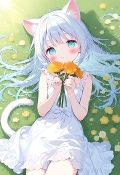 b204,1girl solo long hair white hair cat ears cat tail blue eyes lying on grass white dress holding flower smile blush bright sunlight green field soft focus cat girl relaxed pose outdoors