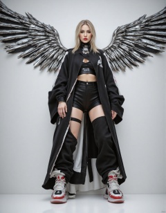 A high-quality, hyper-realistic digital art portrait of a woman standing in a straight pose, exuding confidence and power. She wears oversized black and white urban futuristic clothing, featuring exaggerated asymmetrical designs with bold, sharp lines that create a striking contrast. Her oversized sneaker boots, blending streetwear with avant-garde fashion, complete the look with a street-ready yet cutting-edge appeal. Behind her, chrome Chromecore wings extend outward in full stretch, their gleaming metallic sheen reflecting light with intricate details that highlight their futuristic design. The wings, poised for takeoff, add a sense of fantasy and movement to the otherwise static scene. The interplay between her sleek urban outfit and the shimmering wings enhances the visual impact, merging the edge of modern street fashion with the allure of futuristic fantasy. The minimalistic background further emphasizes her bold presence, focusing on the sharp contrast between her attire and the metallic wings, while the overall color palette and lighting capture the dark, high-contrast theme, with a focus on perfection and detailed craftsmanship, especially around the hands and pose, masterpiece, high-quality, (elaborate fine details:1.1), (hyperdetailed:1.1), (intricate details:1.0), (Refined details:1.1), (best quality:1.1), (high resolution:1.2),detailed city